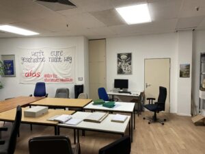 As part of our project, we have been conducting study visits to Germany’s most important archives to explore the specifics of the resources collected there and the methods of processing them. One of the major sites we explored was the Archiv für alternatives Schrifttum (Afas) in Duisburg. This unique archive focuses on the documentation of alternative movements, offering a rich collection of materials related to various forms of social activism. The Afas collection includes a wide range of source materials – newspapers, newsletters, pamphlets, posters, banners, stickers, badges or audiovisual recordings.